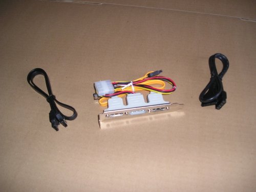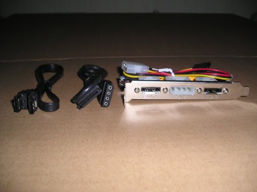 Slotblech zum Anschluß von bis zu 2 externen e-SATA oder SATA Festplatten.Das Slotblech enthält 1x Stromanschluss, für den ein 12V Molex-Anschluss des Netzteils benötigt wird.